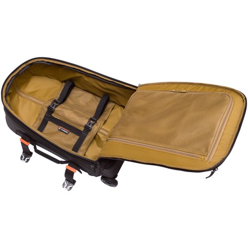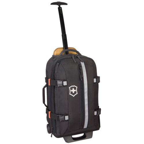 Removable, adjustable waist strap with secure buckle closure evenly distributes weight and the zip-away wheel cover protects clothing from dirt and debris when the bag is worn as a backpack