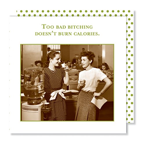 - Humorous pairing of retro photograph and quote or message on front, colorful polka dot pattern on back; great for a cocktail party, wine tasting, or girls' night
