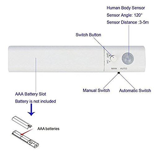 - POWER SAVING -- Operated by 4 AAA batteries (Not Included)!!LED consumes up to 2.4W to Produce the same light as up to 10W incandescent bulb.Only lighting up when it picks up your movement, Auto shut-off.