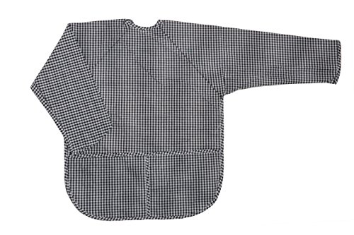 This All-purpose Gingham Smock is a Cost-effective choice for a variety of uses. Perfect for everyday use, arts-in-crafts and messy activities, this bib smock features a spill proof lining, tie Velcro closure, long sleeves for the ultimate in clothing protection, and 2 pockets to hold all of the drips and splatters (and is also great to hold art supplies) so you can rest easy that you little ones clothes will stay clean. Easy to wash, simply throw it in the washing machine set it for warm, gentle wash. DO NOT BLEACH IT, HANG DRY ONLY, NO IRON. Shell: 55% cotton 45% polyester, lining: 100% vinylFeature