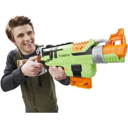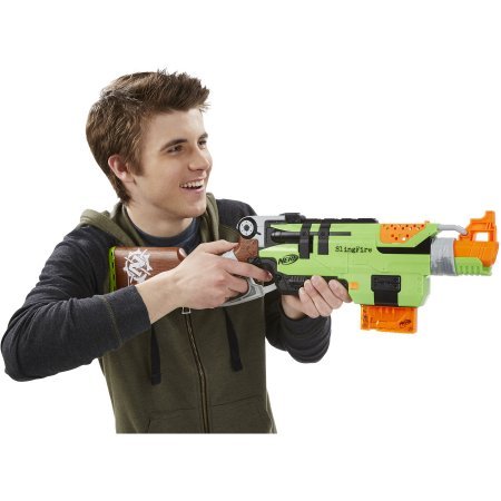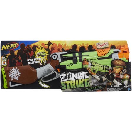 -. Binding : Toy -. Brand : Strike -. Color : Multicolor -. EAN : 0634154127490 -. Feature : Zombie Strike SlingFire Blaster has lever-action blasting Dart blaster cocks 2 ways; Swing the lever or flick to cock it with one hand / Includes a 6-dart clip and 6 Zombie Strike darts The tactical rail lets you add accessories so you gain more battle advantage (sold separately) / Nerf and all related characters are trademarks of Hasbro Well-suited for kids ages 8 years and older / To avoid injury: use only darts designed for this product / Do not modify darts or dart blasters Do NOT aim at eyes or face -. IsAdultProduct : 0 -. Label : Nerf -. Manufacturer : Nerf -. ProductGroup : Toy -. ProductTypeName : TOYS_AND_GAMES -. Publisher : Nerf -. Size : Medium -. Studio : Nerf -. Title : Nerf Zombie Strike SlingFire Blaster -. UPC : 634154127490