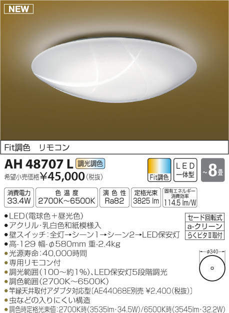 ●調色時定格光束値:2700K時(3535lm・34.5W)/6500K時(3545lm・32.2W)