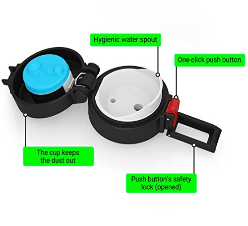 ONE HAND OPERATION - push button opens a flip top lid with a single button click. UNDER THE TOP THERE IS A SIPPING DEVICE, WHICH IS KEPT HYGIENICALLY CLEAN from dust or whatever is around you at the moment. And a SAFETY LOCK prevents dripping accidents (if the bottle is in your bag for example)
