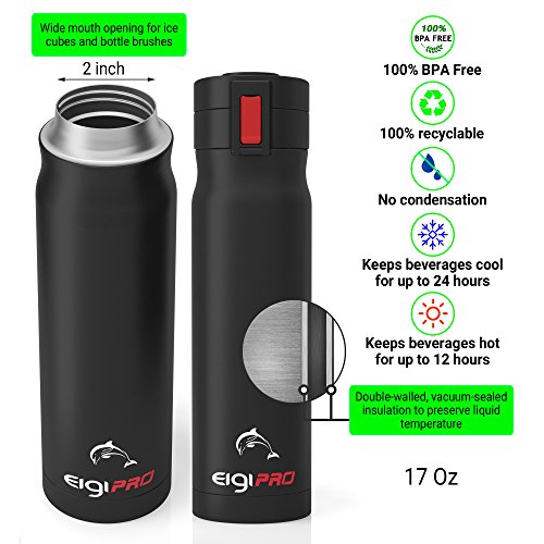 Eigi-Pro Stainless Steel Water Bottle with Double-wall vacuum insulation so that your beverages will stay hot or cold for hours. With a push button a flip-top lid opens, for one hand operation. 17 Oz.