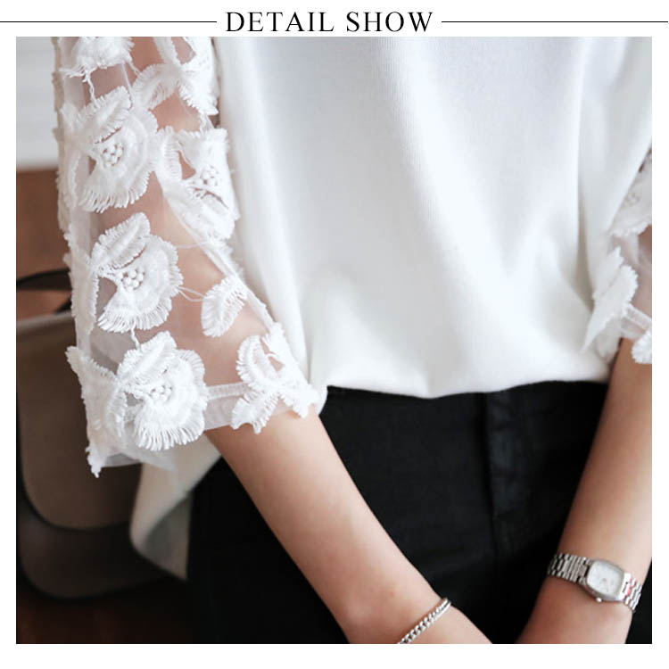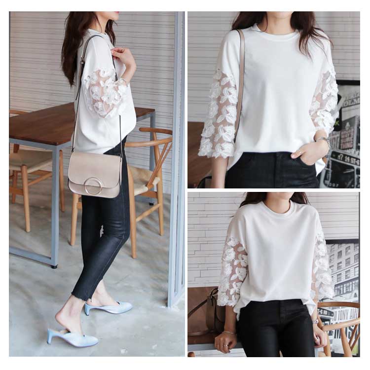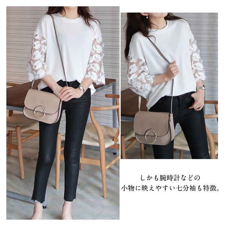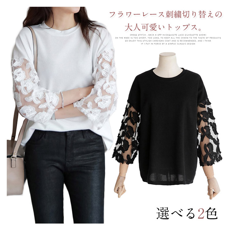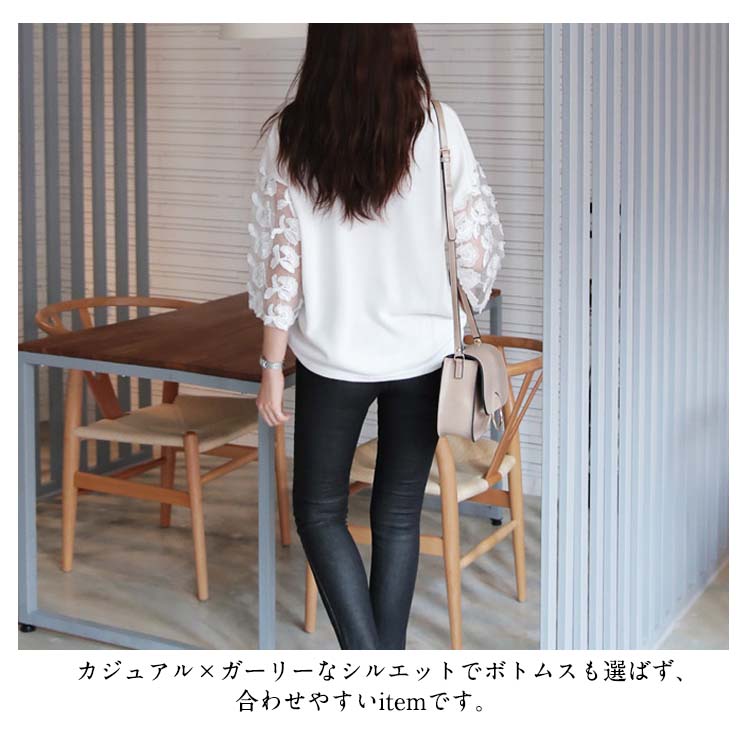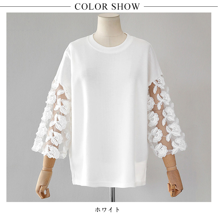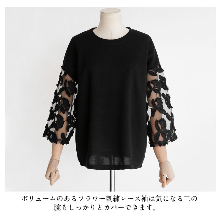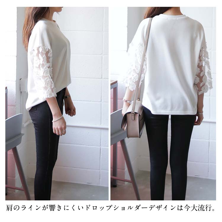 | フラワーレース刺繍切り替えの大人可愛いトップス。ボリュームのあるフラワー刺繍レース袖は気になる二の腕もしっかりとカバーできます。しかも腕時計などの小物に映えやすい七分袖も特徴。さらり気持ちの良い肌触りで一年を通して長くご愛用頂けます。肩のラインが響きにくいドロップショルダーデザインは今大流行。カジュアル×ガーリーなシルエットでボトムスも選ばず、合わせやすいitemです。 | |