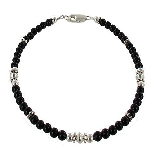 Black Onyx & Sterling Silver Ladies Anklet w/ Bali Style Daisies, Available Lengths: 9" - 12" (Lobster Clasp, Jump Ring, Crimps & Beads - .925 Sterling Silver) (Daisies Only - Silver Plated Base Metal)Feature
