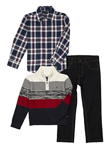 Nautica Toddler Boys' Quarter Zip Sweater, Button Down Shirt, and Denim Pant Set, Cream, 3T
