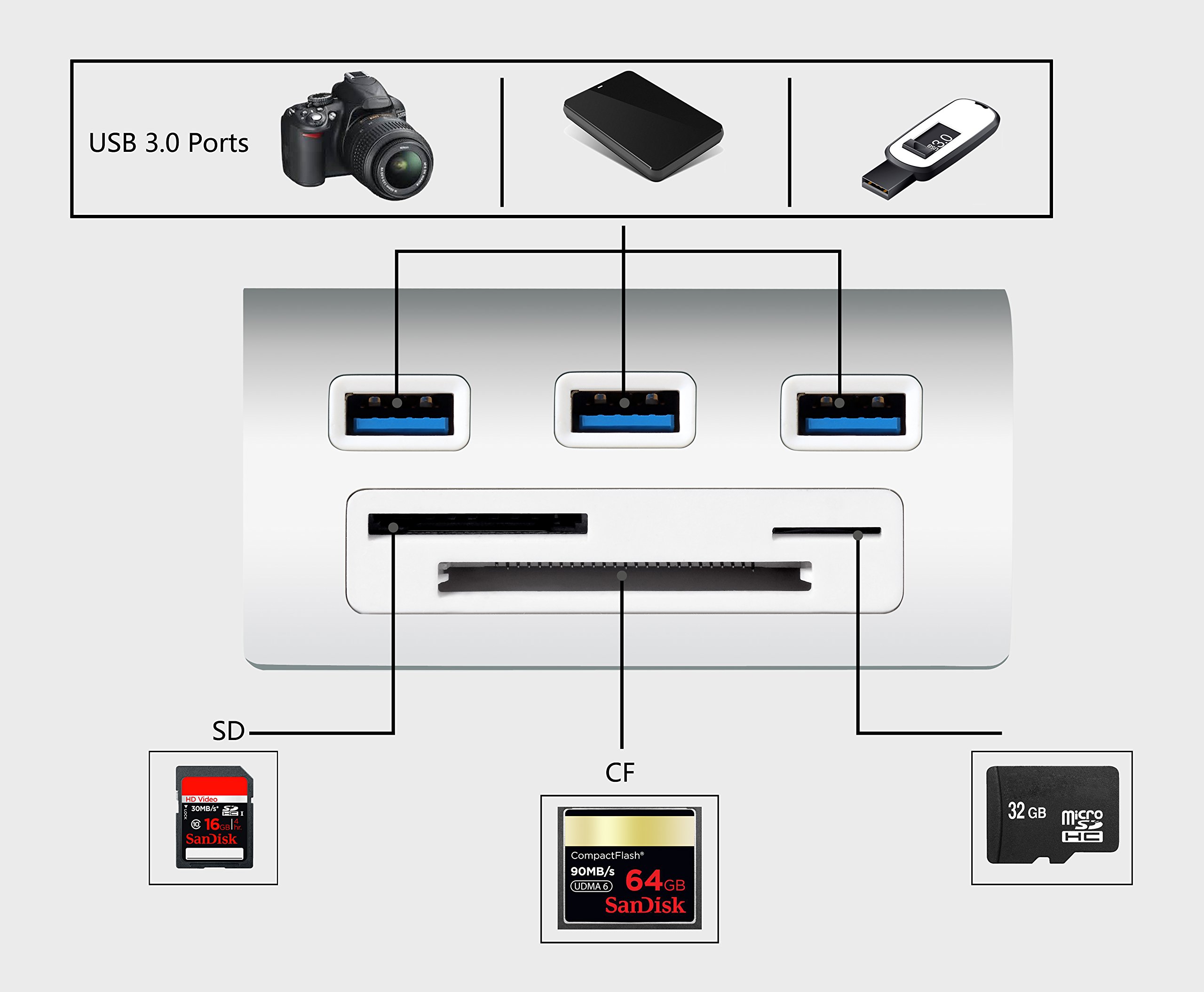The USB 3.0 hub with Cateck card reader is specially designed for laptops, tablets and ultra books and easily extends one USB 3.0 high speed port to three.