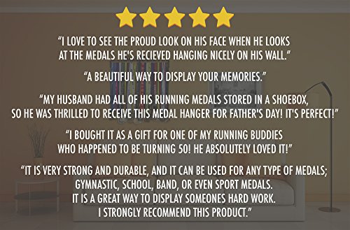 2. HEAVY DUTY MEDAL HANGER DISPLAY: Made out of pure steel the Marathon Medal Display will not bend over time. It's a perfect reminder for the hard work you've put in, and it's a perfect fit for gymnastics, marathon, basketball, running, volleyball, swimming, tennis or triathlon medals.