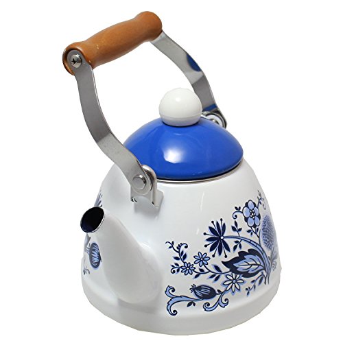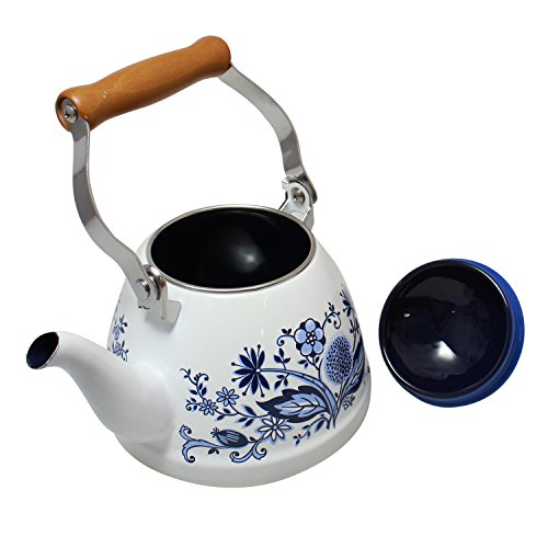 QUALITY MATERIAL MADE - Made with steel in the interior, and an enamel coating on the exterior interior with a graceful curved spout & two-tone blue and white knobbed lid cover. This classic tea kettle also features a wooden handle design for easy grab as well as adding a nice touch to the kettle itself.