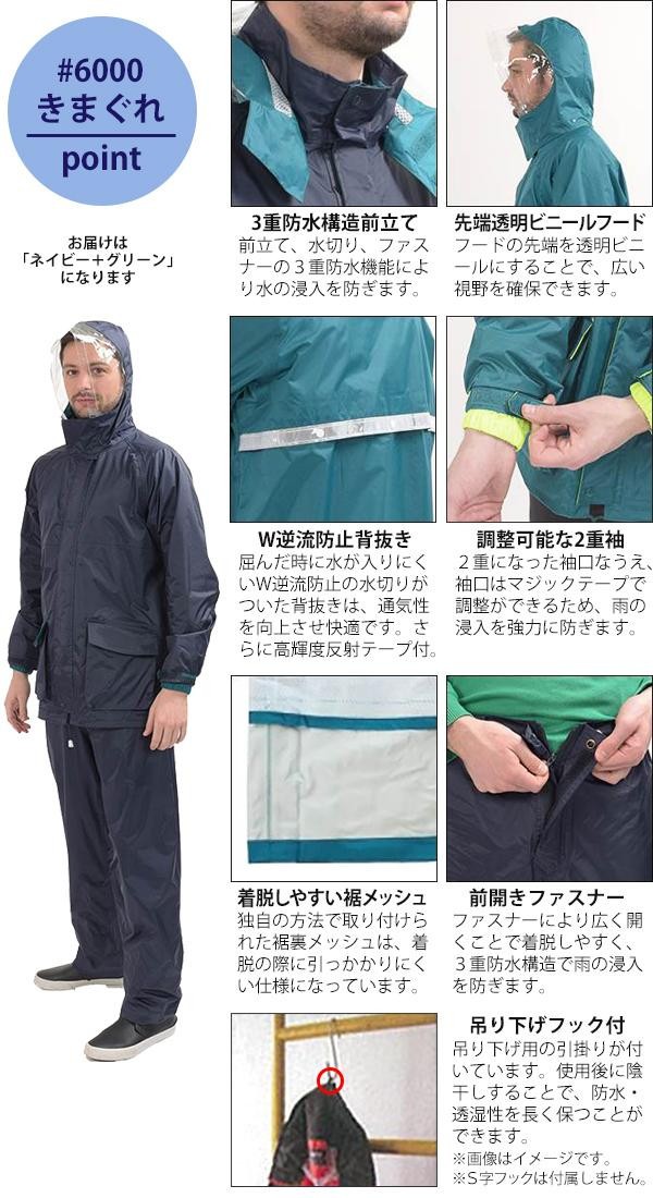 ジャケット、パンツともに多くの機能を持つハイスペックレインウェアです。 製造国:中国 素材・材質:表地:ナイロン100%裏:PVC高弾性樹脂裏地:ポリエステル100%(メッシュ) 仕様:上下セット男女兼用パンツ腰ゴム(ベルト付)ポケット付(上着両脇2箇所、パンツ後1箇所)吊り下げフック付(上着のみ)収納袋付手洗い推奨タンブラー乾燥不可 ※サプライヤー直送品 ※2019年6月下旬入荷分予約受付中【商品名】アーヴァン きまぐれ M ネイビー グリーン 6000
