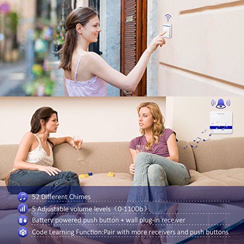 52 Different Chimes, including Christmas Song (Jingle Bells). 5 adjustable volume levels from 0 to 110dB to meet different requirements. This wireless doorbell has memory function that can remember the last music chime you set