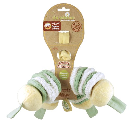 Baby is off to a Green start with Dandelion toys made of soft organic cottons and filled with fluffy, natural corn. Secure this original creation onto any handle and baby is happy playing without dropping. Ingeniously simple, no other assembly required. Machine washable. One of a kind Dangle has rattle, squeaker and crinkle sounds. Featuring Organic cotton velour, waffle weave, terry and canvas. Filled with soft, natural corn fibers.Feature
