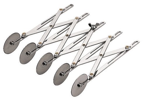 Accordion dough cutter with its adjustable width.Multi wheeled dough cutter makes strips in no time.Material: Stainless steel.Overall dimensions: 2.125'' H x 9.50'' D.
