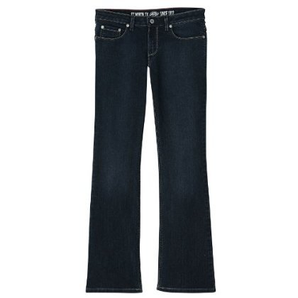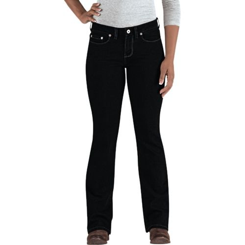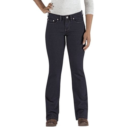 Dickies misses midrise curvy boot cut stretch denim 5-pocket jean with contour waistband with interlining to prevent gapping in back. Signature brand stitching on back pockets and rivet reinforcements on front pockets.Feature