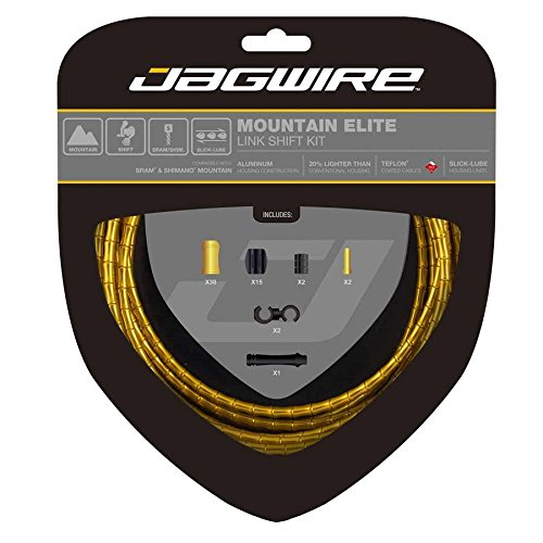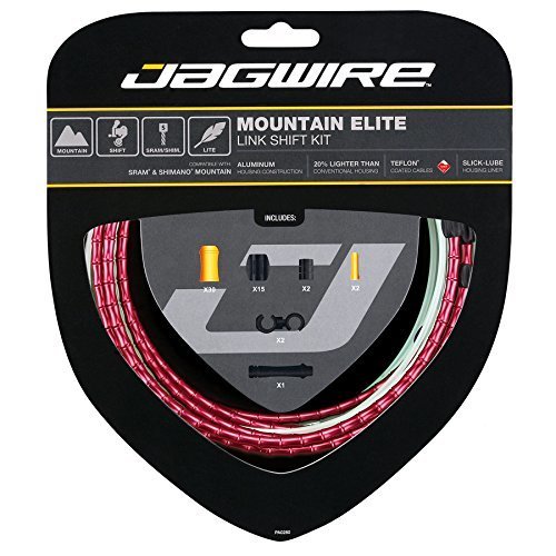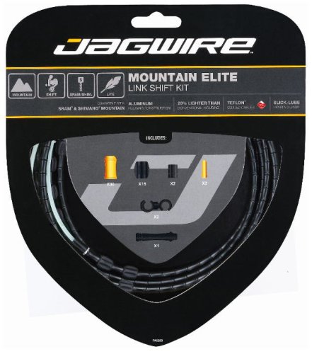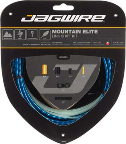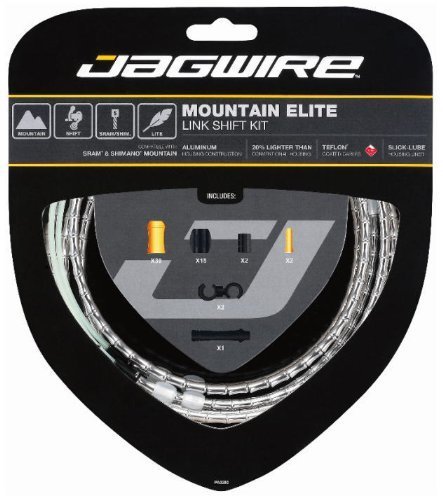 Studio : Jagwire Publisher : Jagwire Binding : Misc. Product Description In a sea of knobby-tired rigs, the Jagwire Mountain Elite Link Shift Cable Kit lets your whip stand out from the crowd with an eye-catching aluminum link design that delivers impeccable shifting for confident gear changes. Jagwire has long been known for producing high-quality cables and housing, and its newest offering manages to be lighter and more durable than traditional housing while eliminating compression for consistent shifting with every lever click. The aluminum link construction resists corrosion while allowing the housing to navigate tight corners and frame transitions without risk of kinking, which makes for smooth, reliable, and precise shifting action. The housing also features a slick-lube liner that works with the Teflon-coated cable to drastically reduce friction compared to non-lubed cable systems for further improved function and exceptional durability. 0