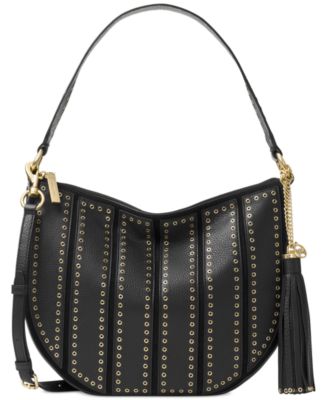 Cast in luxurious suede with grommet-laced leather panels, MICHAEL 's versatile, convertible hobo expertly walks the line between boho and rock'n'roll styling with a swishy tassel accent that hangs decadently from twinkling chain-links at one end. It can be worn over the shoulder or crossbody.12"W x 9"H x 2"D