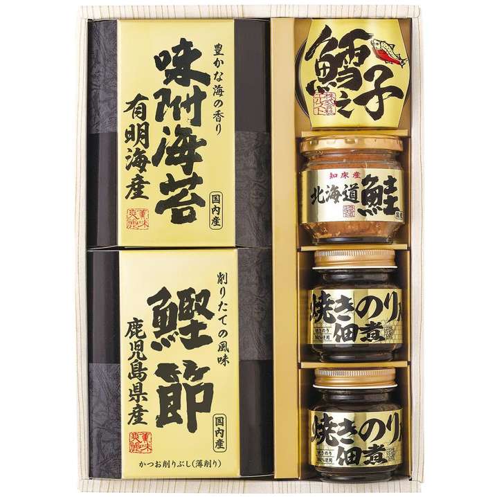 ●その他スペック:<セット内容> 北海道産鮭フレーク約50g×1 焼きのり佃煮約85g×2 たらの子味付け約45g×1 有明海産味付け海苔(8切8枚入×2)×1 鰹削り節(薄削り)約2.5g×4