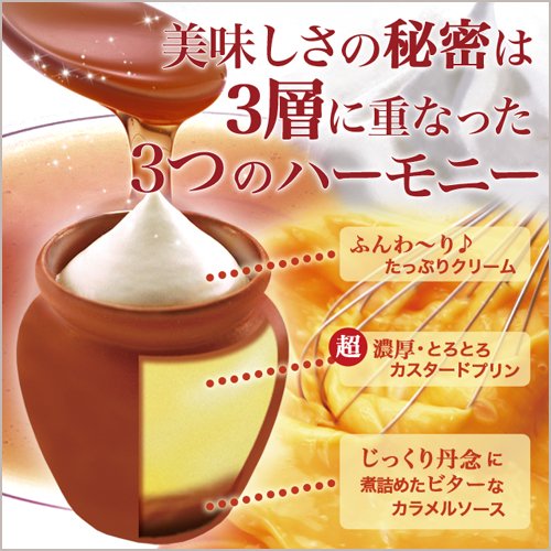 - 可愛い素焼きの壷に入ったとろとろプリンは、まさにすくって食べるような魔法の食感!カスタードが濃厚なプリンの上には、ふんわり甘いクリーム。そして底には、丹念に煮詰めた香ばしいカラメルソース。食べすすめるうちに、次々に美味しさが追いかける、絶妙なハーモニーに。口の中で3つの味が絡まり合う、まったく新しいプリンです。