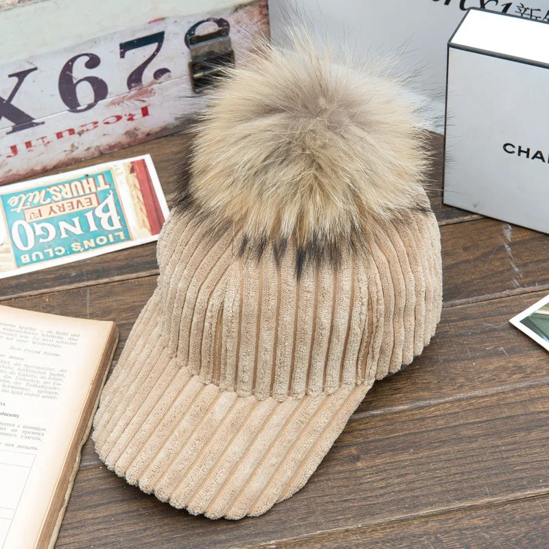 winter fur baseball cap women Material:soft and thicken high quality corduroy, Raccoon fur Pom Poms