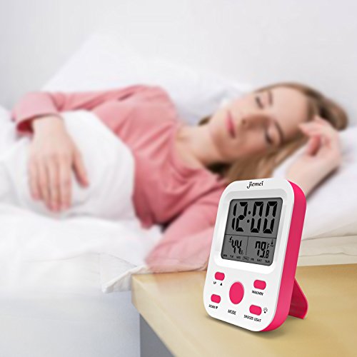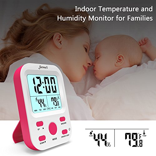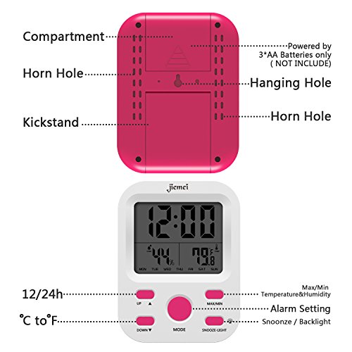 Studio : jiemei Publisher : jiemei Binding : Kitchen Product Description [MULTI-FUNCTION]: Jiemei travel alarm clock designed with large LCD display show Time/Calendar/Temperature/Humidity and unique shell frame, flexible application for desktop standing or wall mounting, shift 12/24 hour format and °F/°C switchable with front buttons, operated by 3 pieces of 7th AAA batteries which are Not included in the package. [GENTAL SOUND SNOOZE FUNCTION]: Our home alarm clock starts out soft and gets progressively louder for 2 minutes until you turn it off. The alarm sounds again after 8 minutes in snoonze mode, the sounds can be stopped by press any button. [SMART and MANUAL BACKLIGHT]: our digial alarm clock can light up automatically in dark with soft nightlight which will not too bright to affect sleeping. And the backlight can be also turned on by pressing " Snooze" button whether dark or daylight which can just last for 8 seconds. [INDOOR TEMPERATURE HUMIDITY MONITOR]: The clock displays real-time temperature and humidity, record the highest and lowest data everyday, the data will be deleted automatically at 0.00 everyday. And temperature range is -9.9~ 60℃(14.2~ 140 F), humidity range is 20 ~ 99%RH. 0