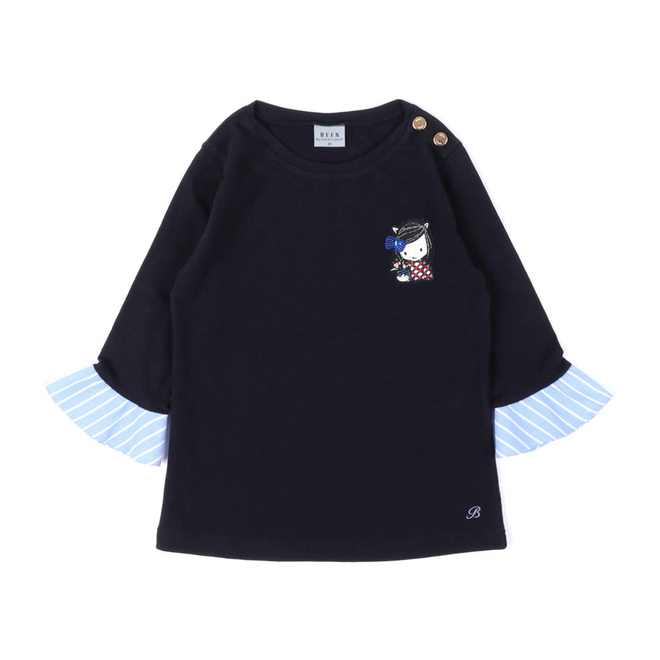 8부정도 소매기장의 스트라이프 프릴 배색으로 발랄해보이며, BEEN의 여아 캐릭터 패치 느낌으로 화사한 포인트를 주었습니다.