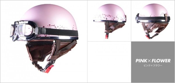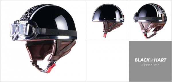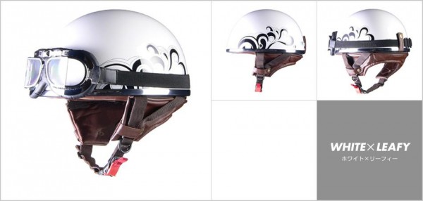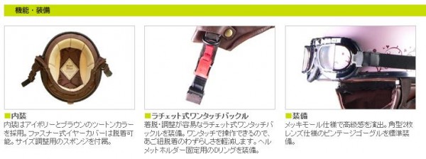 | 帽体のデカールデザインから内装の色にまでこだわり、全体のまとまりとして個性的な角型ビンテージゴーグルを装備し、細部まで創り込んだハーフヘルメット。帽体には傷がつきにくいUV硬化塗装仕上げを施しています。 |