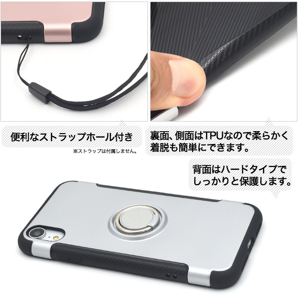 落下防止用のリングホルダーがついたスマホリングホルダー付きケース! リングホルダーは360度回転可能でスタンドとしても使用できます。 PCとTPUを組み合わしたスタイリッシュなメカニカルデザイン。 裏面、側面はTPUなので柔らかく着脱も簡単にできます。 また、背面はPC素材のハードタイプなので、しっかりと本体を保護します。 もちろん、装着したまま充電や各種ボタンの操作も行えるようにデザインされています。 落下防止に便利なストラップホール付きです。 |