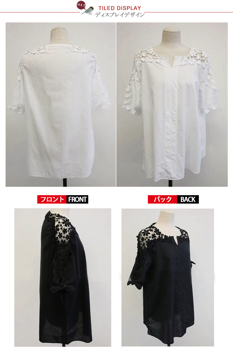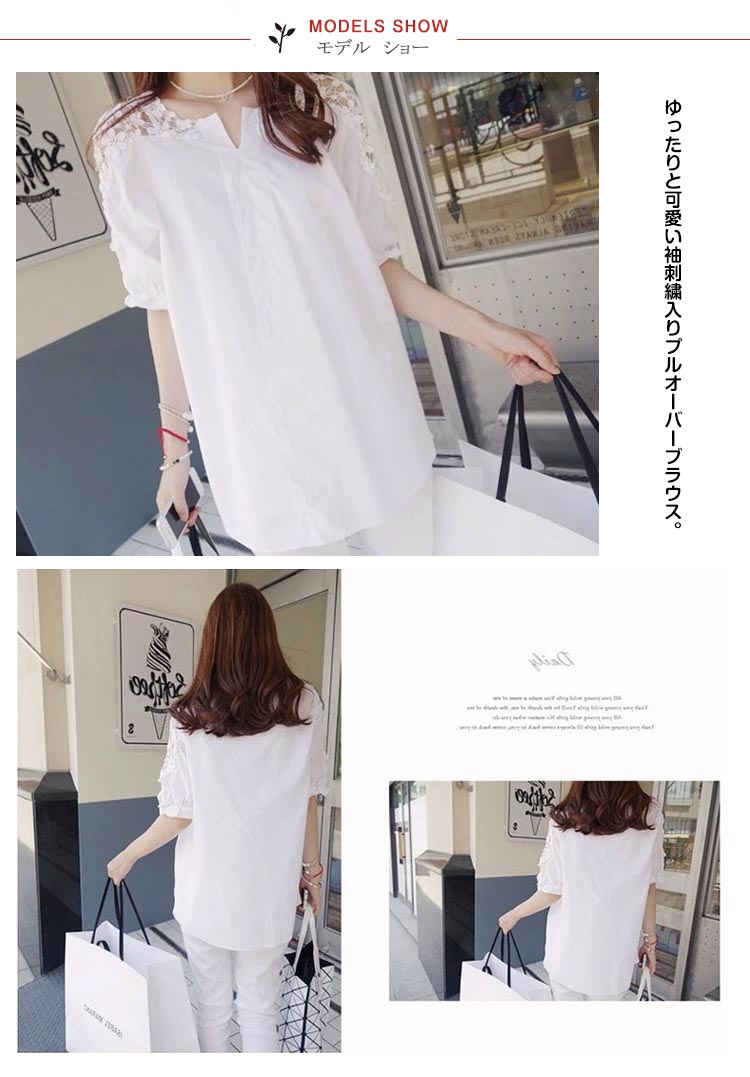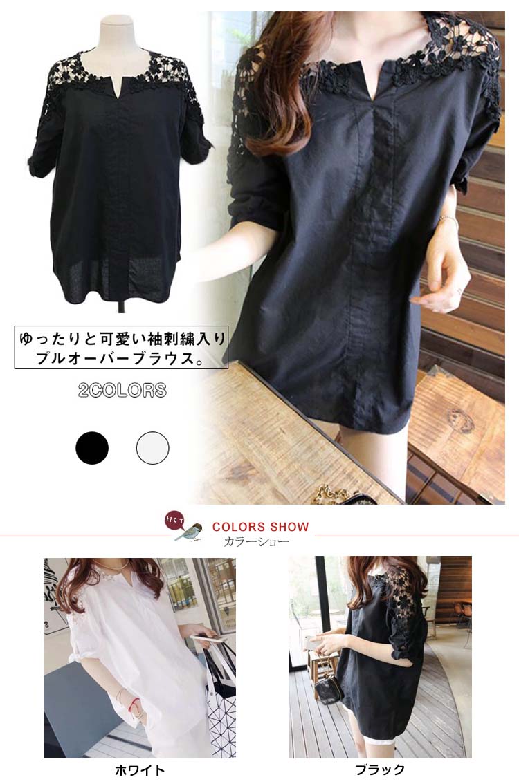 | ゆったりと可愛い袖刺繍入りプルオーバーブラウス。肩見せフラワー刺繍が大人女性らしいセクシーさをアピール。袖口リボンモチーフが可愛さをプラスして大人可愛いスタイルに♪ゆったり大きめシルエットで体型カバー力も抜群。シンプル無地でどんなボトムスにも合わせ易いのでデイリーに大活躍の一枚です? | |