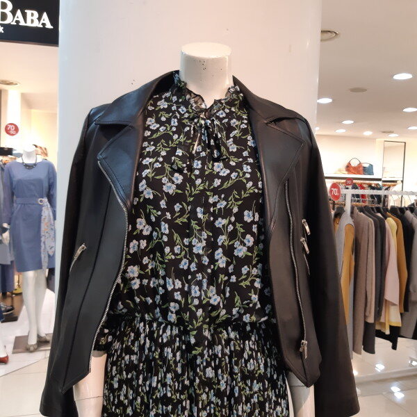 쉬폰소재로 허리아래가 기계주름이라 배가나와보이는걸 최대한커버가능하며 라이더가죽자켓에 코디함 요즘핫한 원피스 시도해봅시다