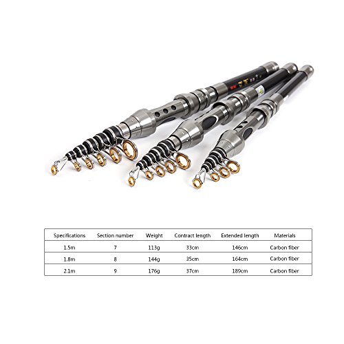 -. Feature : ※Sea rod kit: Selectable carbon Telescopic Rod+ LE3000 Fishing Reel +50cm/19.7in Black Fishing Bag, it is suitable for recreational fishing and competitive fishing. / ※Fishing rod: High grade carbon fiber telescopic sea rod-lightweight and sturdy, aluminum alloy reel seat, ABS +stainless steel +ceramic guide ring-it is smoother for casting and spinning fishing line. 5 selections: 1.5m/4.92ft rod, 1.8m/5.9ft rod, 2.1m/6.9ft rod. / ※Fishing reel: LE3000 Metal fishing reel, high tensile graphite body +graphite spool+ CNC line cup + ABS foldable rocker, right and left interchangeable handle. 8 ball bearings, Gear ratio 5.5:1, line capacity(mm-M): 0.20/270 0.25/120 0.30/140. / ※Fishing bag: Double zippered black fishing bag, single handbag with two straps, it is made of 600D oxford cloth and stainless wire, which is durable and practical. Dimension: main pocket: 50cm*14cm*5cm/19.7in*5.5in*1.97in, small pocket: 40cm*12cm*3cm/15.7in*4.7in*1.2in. / ※Fishing scene: Sea/ocean, river bank, lake and any suitable conditions.