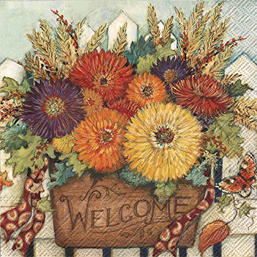 Ideal Home Range 3-Ply Paper Beverage/Cocktail Napkins, 20-Count, 5 x 5-Inches Folded, Mum Basket on Fence