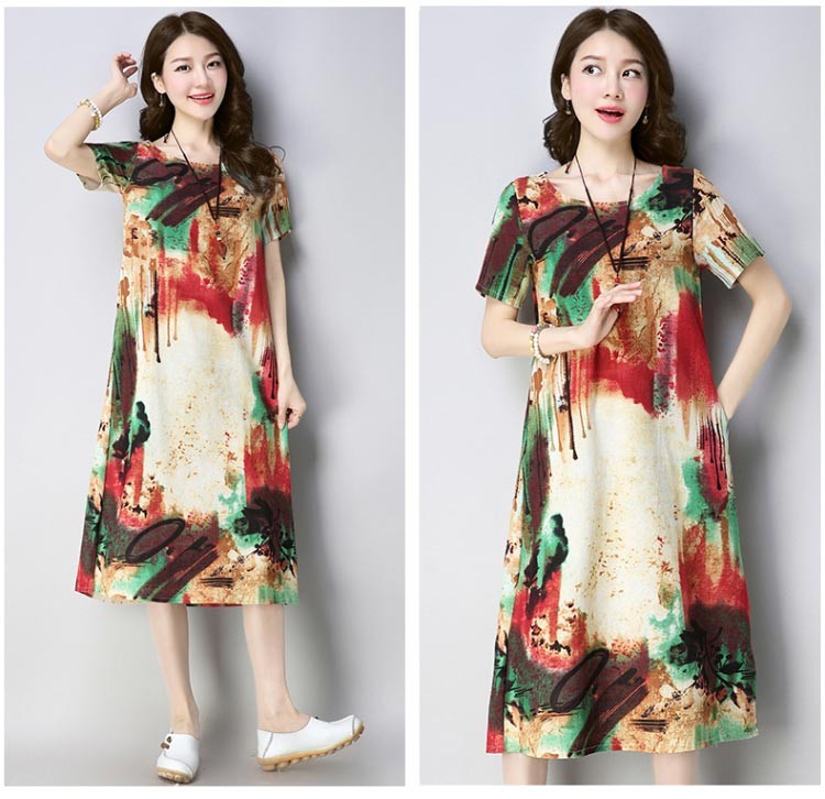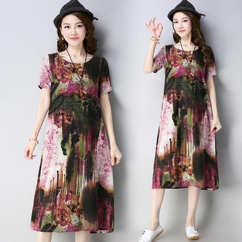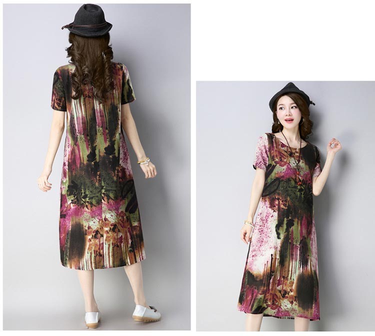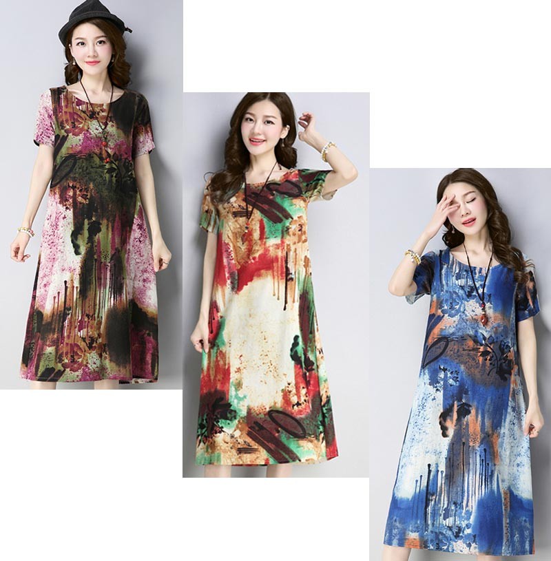 大胆なマルチカラーペイント柄のコットン半袖ルーズシルエットワンピース♪