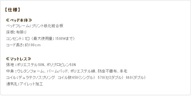 材質:[ベッド]本体-プリント紙化粧合板、コンセント-1口(1500W)、[マットレス]側地-ポリエステル50%・ポリプロピレン50%、中身-ウレタンフォーム・パームパッド・ポリエステル綿・防虫不織布・羊毛、コイル-デュラテクノスプリング・コイル数450、通気孔-アイレット加工