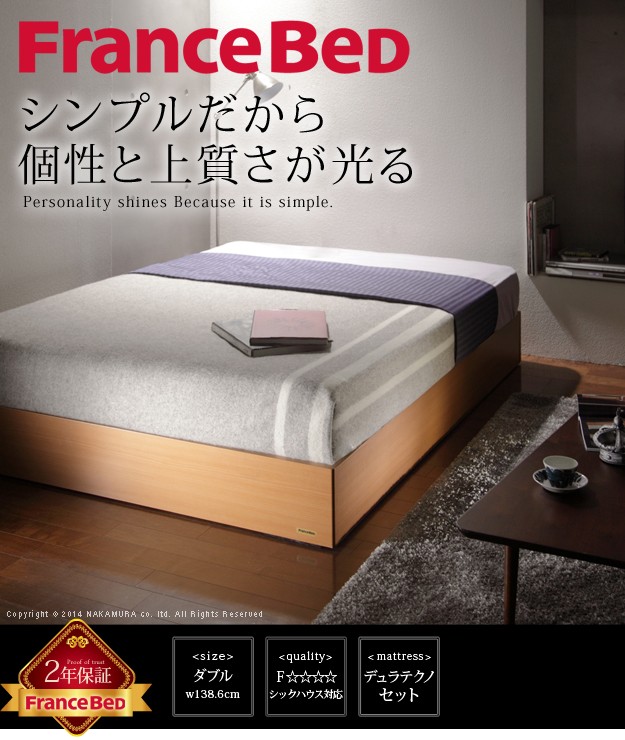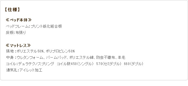 材質:[ベッド]本体-プリント紙化粧合板、[マットレス]側地-ポリエステル50%・ポリプロピレン50%、中身-ウレタンフォーム・パームパッド・ポリエステル綿・防虫不織布・羊毛、コイル-デュラテクノスプリング・コイル数660、通気孔-アイレット加工