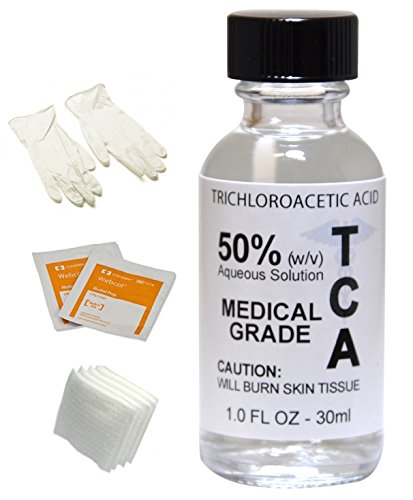 -. Feature : TCA (Trichloroacetic Acid), ACS - Tested for strict Purity by the American Chemical Society / Dramatically Reverse the Signs of Aging - The Most Powerful Exfoliator - Medium Chemical Peel - unbuffered, lower pH for better and deeper peel - Higher Concentrations maybe diluted in Distilled Water / Most Common Percentages for Facial Skin Peel are between (8-35%). The stronger concentrations are commonly used to remove, moles, warts, skin tags and tattoo's / INCLUDED with 50% TCA Peel: 2 Alcohol Prep Pads, Cotton Rounds, Gloves & Instructions