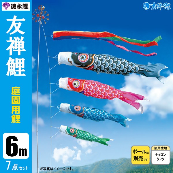 こいのぼり/鯉のぼり 庭園用(ポール別売りになります)(こちらの商品は家紋・名前入れはできません。ご了承ください。)鯉のぼり 室内用 鯉のぼり ポール 鯉のぼり マンション 鯉のぼり 庭 園用 鯉のぼり 手作り 久月鯉のぼり 鯉のぼり ポール 鯉のぼり 徳永 取扱(セット内容)・吹流し6m・黒鯉6m・赤鯉5m・青鯉4m・緑鯉3m・矢車一式・ロープ30m 友禅鯉 日本の伝統美、色あざやかに染め上げた鯉のぼりです。吹流しには魔除けの意味をもつ五色を用いた五色吹流しをセットし、ナイロン生地を使用しているので水に強く、軽くてよく泳ぎます。