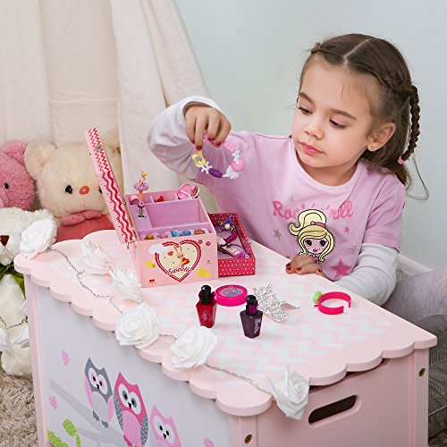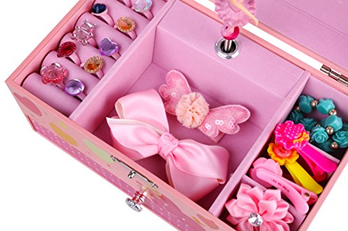 SONGMICS children's musical jewelry box is designed with the purpose of bringing joy to children and enshrining memory for parents alike. This item includes a secret key on the backside, gently wind it clockwise for 1-2 circles then lose your hand, the box will play the Swan Lake tune when the lid is lifted, meanwhile, the spring loaded ballerina inside twirls around. The top compartment of this adorable jewelry box is lined with a velvet-like material while the drawer plus a space under the lid, idea for special treasures little girls like to keep.