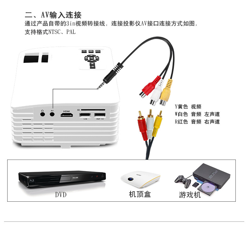 功能:可插U盘。移动硬盘,SD卡,另配HDMI线可连电脑,AV线连接机顶盒,DVD等。