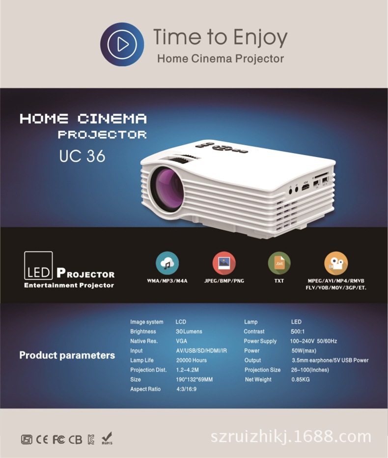 标配含:UC36投影仪主机+遥控器+电源适配器+三合一AV线+说明书+包装盒