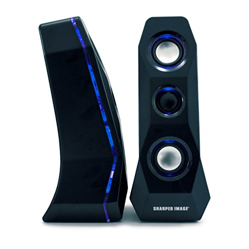 Keep the sound blasting with this 2.1CH Wireless Speaker with Reactive Lights from Sharper Image. The reactive light mode glows along to your soundtrack for a unique, multisensory experience. Bass-enhanced 2.1 computer speakers with subwoofer elevates the audio experience during gaming, movie viewing and music. Expertly engineered to deliver high-definition sound, this speaker system is the perfect addition to your Computer or laptop. This set, which consists of two speakers and a subwoofer, features built-in Bluetooth for quick and easy pairing with smart devices, plus an Aux port for wired sound.Feature