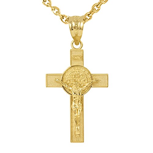 -. Feature : cross-style, Catholic St Benedict crucifix religious protection charm necklace / faithfully handcrafted with authentic 14 karat yellow gold in perfect polished finish / comes with free special gift packaging / made in the USA yet offered at factory direct jewelry P.R.Ice / ships from the manufacturer directly to the customers