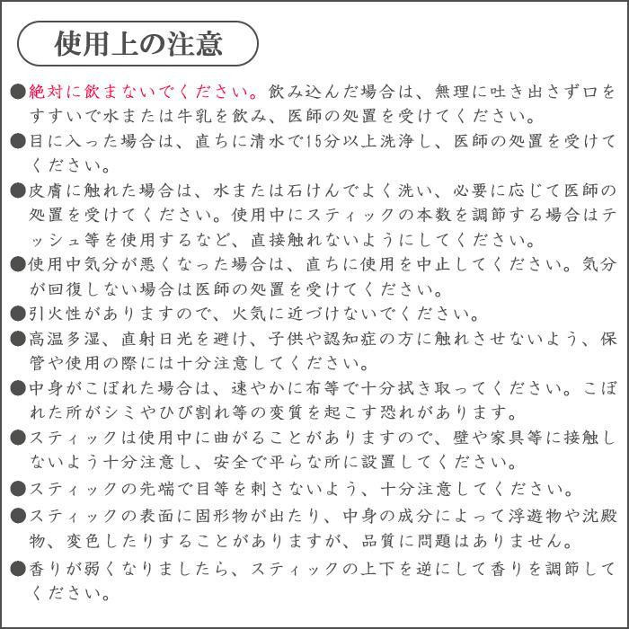 【使用上の注意】 絶対に飲まないでください。飲み込んだ場合は無理に吐き出さず口をすすいで水又は牛乳を飲み、医師の処置を受けてください。 目に入った場合は直ちに清水で15分以上洗浄し、医師の処置を受けてください。 皮膚に触れると、かぶれる恐れがありますので注意してください。触れた場合は、水又は石けんでよく洗い、必要に応じて医師の処置を受けてください。 使用中にスティックの本数で香りの調節をする場合はティッシュ等を使用し、直接触れないでください。 使用中気分が悪くなった場合は、直ちに使用を中止してください。気分が回復しない場合は医師の処置を受けてください。 引火性がありますので、火気に近づけないでください。 高温多湿、直射日光を避け、子供や認知症の方に触れさせないよう、保管や使用の際には十分注意してください。 用途以外に使用しないでください。 容器を傾けると、中身がこぼれますので注意してください。 中身がこぼれた場合は、速やかに布等で十分拭き取ってください。こぼれた所がシミやひび割れ等の変質を起こす恐れがあります。 スティックは本品以外に使用しないでください。 スティックの先端で目等を刺さないよう、十分注意してください。 スティックは使用中に曲がることがありますので、壁や家具等に接触しないよう十分注意し、安全で平らな所に設置してください。 スティックの表面に固形物が出ることがありますが、品質に問題はありません。 中身の成分によって浮遊物や沈殿物、色や香りに違いが生じたり、変色することがありますが、品質に問題はありません。 香りが弱くなりましたら、スティックの上下を逆さにして香りを調節してください。 |