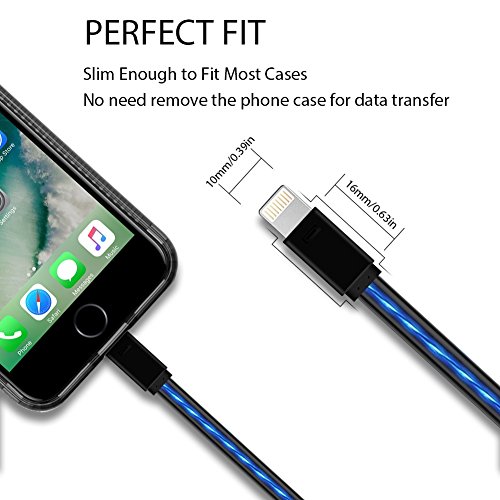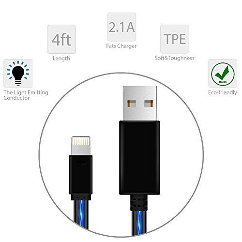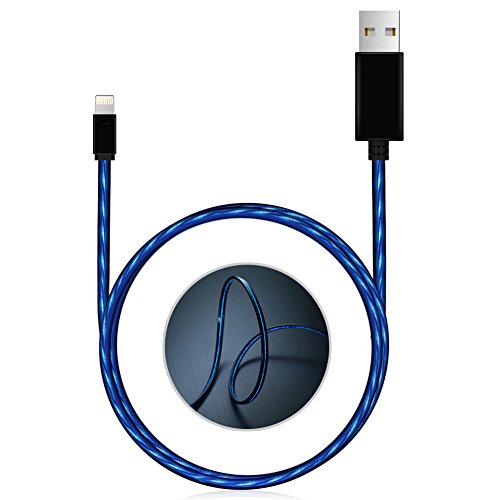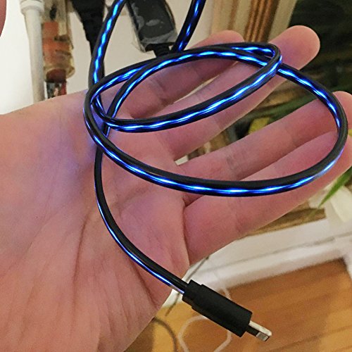 A. Visible Flowing Light - This gorgeous lightning cable features a amazing visible flowing LED light, there will be a beautiful blue light flowing along the cable when plugging it in and charging your device, which makes it a perfect decoration with the room, office or car, and it is easily found at night especially.