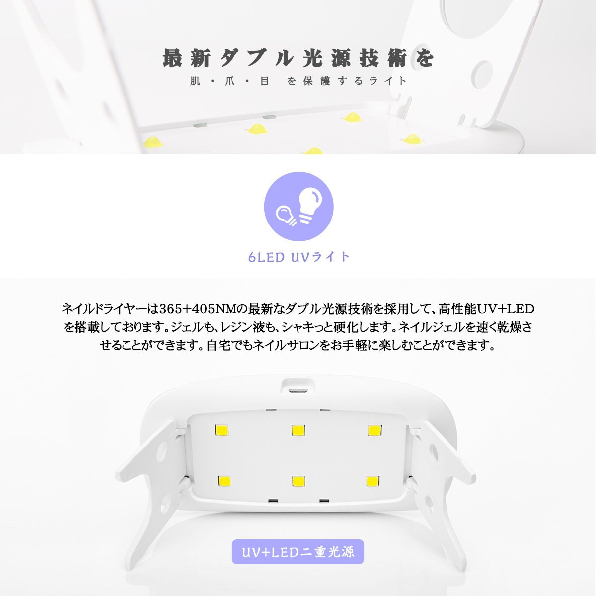 - 最速ダブル光源技術を採用!UV+LED二重光源:ダブルスピード硬化ダブルパワー機能で硬化速度を2倍。