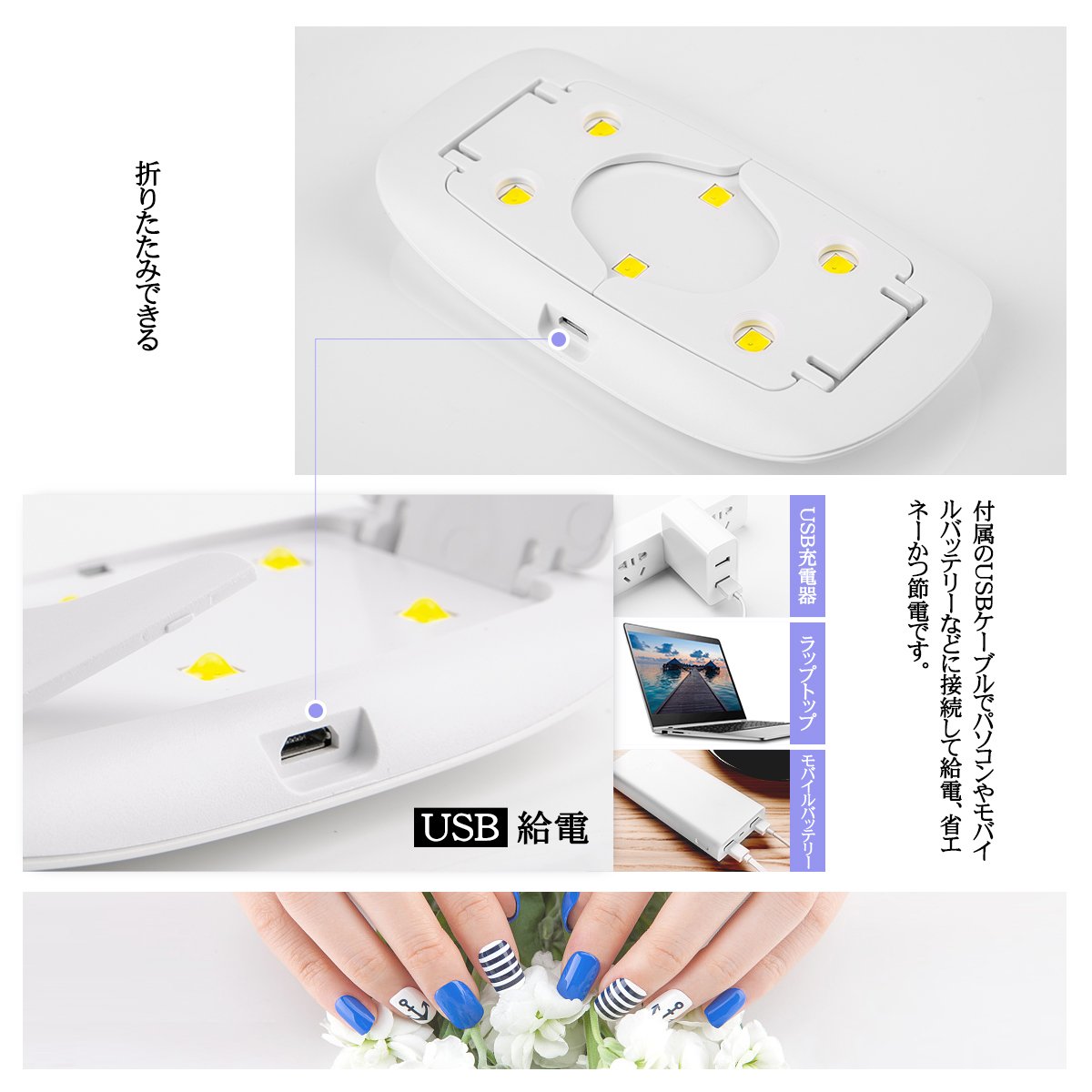 - usb給電:付属のUSBケーブルでパソコンやモバイルバッテリーなどに接続して給電、省エネーかつ節電です。