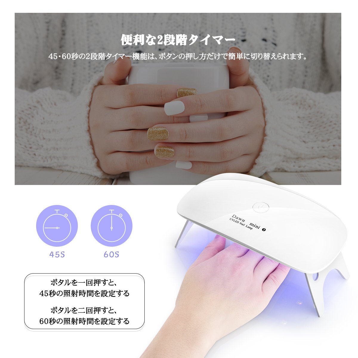 - 便利な2段階タイマー:45・60秒の2段階タイマー機能は、ボタンの押し方だけで簡単に切り替えられます。 ボタルを一回押すと、45秒の照射時間を設定する ボタルを二回押すと、60秒の照射時間を設定する