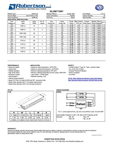 ROBERTSON 2P20158 ISL296T12MV Pak of 10 Fluorescent eBallasts for 2 F96T12 Lamps, Instant Start, 120-277Vac, 50-60Hz, NBF, HPF, (For HO lamp applications the recommended ballast is the PSB296T12HOMV)