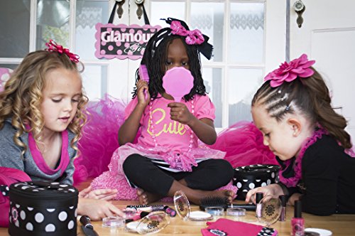100 % FAKE! No transfer of color or substance! Our Super Deluxe Kit offers even MORE makeup for countless hours of fun and NO mess for anyone! We've added all the extras into this Super Deluxe Kit! Glitter Gloss, Lip Rollers and Nail polish complete the Super Deluxe Kit. Real brushes and real compact puff add a real-life experience to our silky-smooth play makeup that looks and feels like the real thing! Complete with our Classic Black and White Polka Dot cosmetic case AND our Classic Mini-Clutch Purse so your play makeup can go anywhere with you! Super Deluxe Kit Includes: 1 Pressed Powder Compact, 1 Four-Piece Brush Set, 3 Eyeshadows (Pinkle, Mocha, & True Blue) 1 lip color (Cherry Blossom) 1 Blush (Pink Petals) 1 Glitter Gloss 3 Lip Roller (Raisin, Posie Pink, & Cotton Candy) 2 Nail Polish (Baby Pink & Razzleberry Red) 1 Small Polka Dot Clutch Purse 1 Black & White Polka Dot Cosmetic Case Small Parts. CHOKING HAZARD. NOT FOR CHILDREN UNDER THE AGE OF 3. NOTE: THIS MAKEUP IS NOT REAL MAKEUP! 100% FAKE MAKEUP! DOES NOT TRANSFER ANY COLOR OR SUBSTANCE!Feature