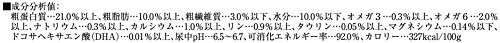 素材構成:粗蛋白質…21%以上、粗脂肪…10%以上、粗繊維質…3%以下、水分…10%以下、カルシウム…1.0%、リン…0.9%、ナトリウム…0.3%、タウリン…0.05%、ドコサヘキサン酸(DHA)…0.01%、オメガ3…0.5%以上、オメガ6…3.0%以上、尿中pH…6.5~6.7